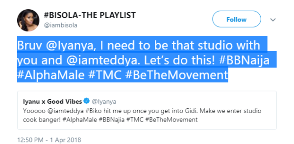 First runner-up of the 2017 edition of Big Brother Naija, Bisola, who reacted to the tweet, begged to work on the new song with Iyanya and Bisola. Here’s what she wrote below;