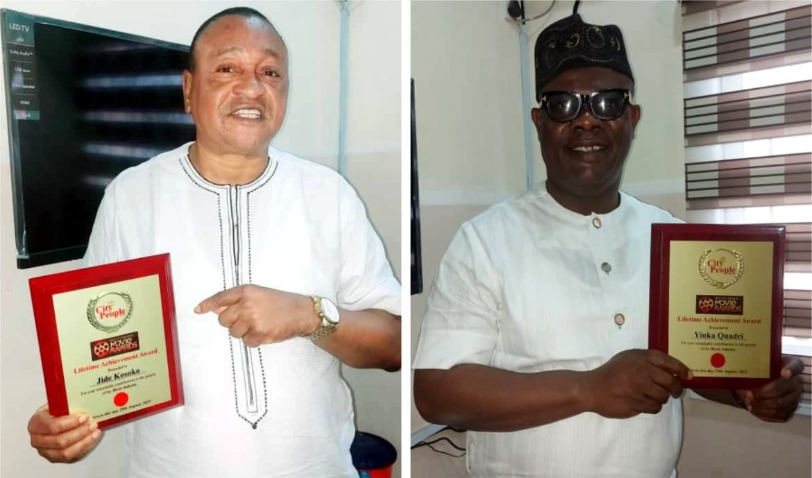 At the just concluded City People Movie Awards in Abeokuta, Prince Jide Kosoko & Alhaji Yinka Quadri were 2 veteran actors/movie producers were honoured. But both of them couldn’t make it to the event. City People Publisher, SEYE KEHINDE and SUNDAY ADIGUN visited the two of them in Ikorodu, Lagos last week to give them their plaques after which both did a joint interview on their careers and the state of the industry today.