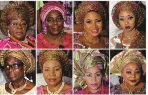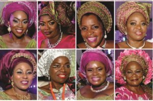 Society women and ladies trooped out en masse penultimate weekend, precisely Saturday, 1st, April 2017 when the children of 2 popular families, the Oyinlolas and Okunowos joined their children in a royal traditional wedding. The groom, Oluwajuwon Ekundayo is the son of Chief Olubukunola Okunowos and Mrs Kehinde Okunowo, while the bride, Olayinka Oluwatomilola is the daughter of Former Osun Gov, Prince Olagunsoye Oyinlola and Princess Omolola Oyinlola. The colourful traditional wedding was held at the prestigious Balmoral Center, Federal Palace Hotel, Victoria Island,Lagos. As usual, it was attended by very Important Personalities and it will be an understatement to say the car park was full to the brim. Cars were parked on all lawns of the hotels and even outside the hotel,along the kebs on the main road,cars were fully parked which occupied almost a very long stretch of the Ahmadu Bello Way.It was a hectic day for other road users as all roads were jam packed due to the entourage of celebrities who stormed the wedding. Give it to our society women, it was a show of style and finnese as they all turned out in their colourful attires. The colours of the day were Olive and shades of pink. Both colour mix did justice to guests outfit as it came out nice on everyone. Many of the guests wore a pink outfit while the headgear which was the gele ebi sold was a mix of olive and Fushia pink.