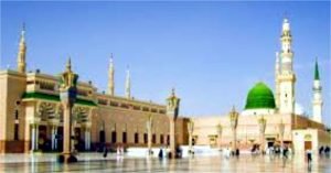Al-Masjid an-Nabawi which simply means the Mosque of the Prophet is located in the city of Medina, Saudi Arabia. It is the second holiest site in Islam. The Mosque was originally the House of Muhammad; he settled there after his migration to Medina, and later built a mosque on the grounds. He himself shared in the heavy work of construction. The original mosque was an open-air building. The Mosque also served as a community center, a court, and a religious school. There was a raised platform for the people who taught the Quran. The basic plan of the building has been adopted in the building of other mosques throughout the world.