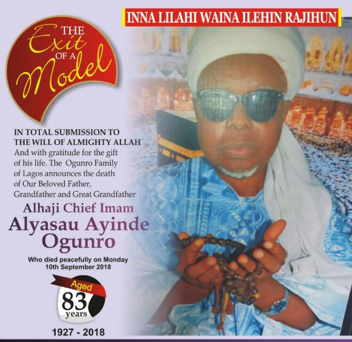 The late Imam Sheikh Alyasau Ayinde Ogunro was born in Lagos 83 years agoattended Lagos City College and finished from the school in 1964. He started work with the Levent Group and rose to the level of a Senior Manager in Levent. He was nominated as the Chief Imam of Quranic Central Mosque and this position he held on till 1980 when he was then turbaned the Chief Imam of Quranic Central Mosque for the whole Lagos State, under him, were close to 36 other Imams.