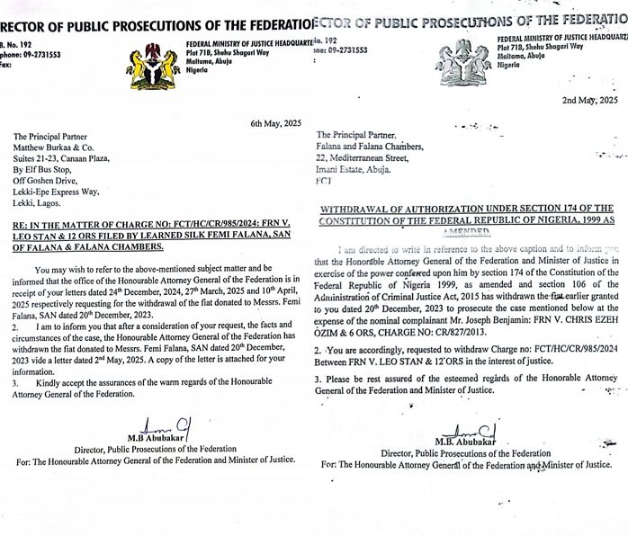 In the latest development, the current AGF, Mr. Lateef Fagbemi SAN, in a letter dated 2nd May 2025, addressed to The Principal Partner, Falana and Falana Chambers, and signed by Mr. M. B. Abubakar, Director, Public Prosecutions of the Federation, directed Falana to withdraw Charge No: FCT/HC/CR/985/2024 (FRN. v. Leo Stan and 12 others), in the interest of justice; signifying that the fiat ought not to have been donated to him in the first place.