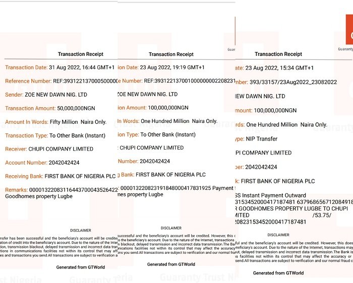 Also, at 7:19 PM on August 23, 2022, Zoe New Dawn Nig. Ltd, through the same Guaranty Trust Bank account, made another N100 million payment to Chupi Company Limited’s First Bank account, with a transaction remark, “Payment for Goodhomes Property, Lugbe.”