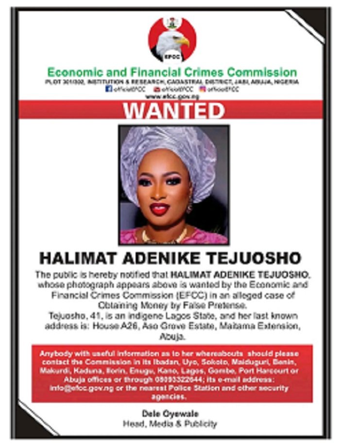 The notice signed by Dele Oyewale, the Head of Media and Publicity for the EFCC, partly read: “The public is hereby notified that HALIMAT ADENIKE TEJUOSHO, whose photograph appears above is wanted by the Economic and Financial Crimes Commission (EFCC) in an alleged case of Obtaining Money by False Pretense.