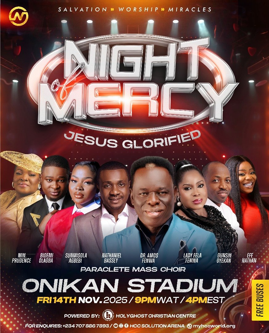 The atmosphere is charged with excitement as the HolyGhost Christian Centre sets the stage for one of the most anticipated worship gatherings of the year, “Night of Mercy”, themed Jesus Glorified. The grand concert is scheduled to hold on Friday, November 14, 2025, at the historic Onikan Stadium, starting at 9 PM.