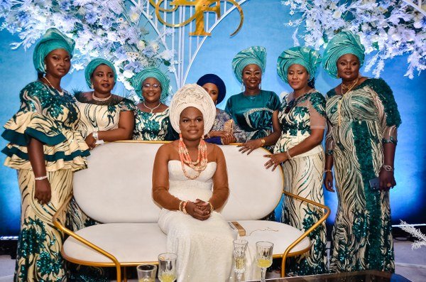 The bridal train formed a long line dressed in the indigenous “aso oke” sewn into “oleku” style, with matching “gele”.