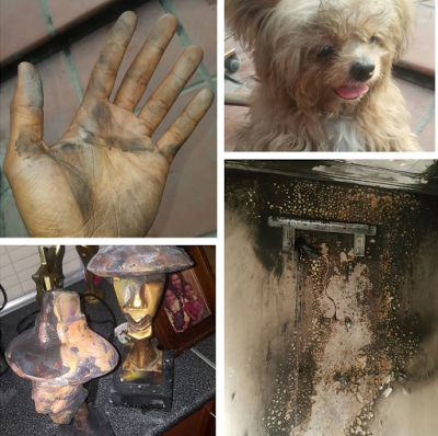 Thank God I was awake to smell the smoke. Thank God we caught it early enough and the damage wasn’t so bad.. it basically burnt some of the stuff that was around it. So awards, portraits, and some small electronics. But thank God, Duke and I are alive and well. We only had to form James Bond and climb down from the top floor balcony LOL ?? Thank God for my neighbors and the amazing workers in and around the compound for helping us escape via the balcony, helping put out the fire, and helping with the aftermath/cleaning.