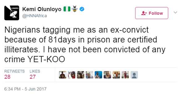 Journalist and blogger, Kemi Olunloyo, who was released barely 24 hours ago, after spending 81 days in a Port Harcourt prison, took to Twitter to blast those calling her an ex-convict.