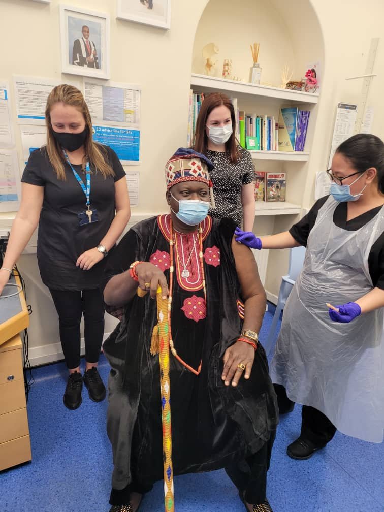 Oba Arowotawaya II took the vaccine at the Rosewood Medical.Centre, Hornchurch, UK where he is currently.