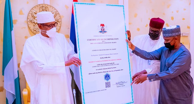 President Muhammadu Buhari has received the Certificate of Incorporation of the Nigerian National Petroleum Corporation (NNPC).