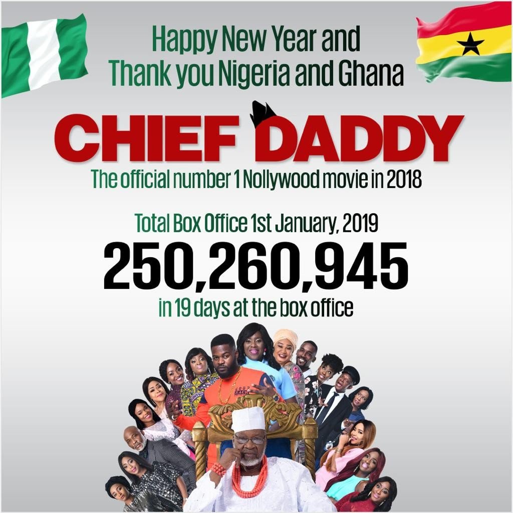 The Niyi Akinmolayan film opened in cinemas on Friday, December 14th and has maintained the number oneposition for local movies since then, despite competing with a strong lineup of holiday releases. And Chief Daddy is off to a bright start for 2019, with revenues over N14 million on New Year’s Day, taking it to N250,260,945 in total.