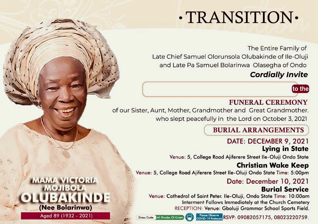 The Burial service will hold at the Cathedral of St. Peter, Ile Oluji, Ondo State, As Interment follows immediately at the church cemetery