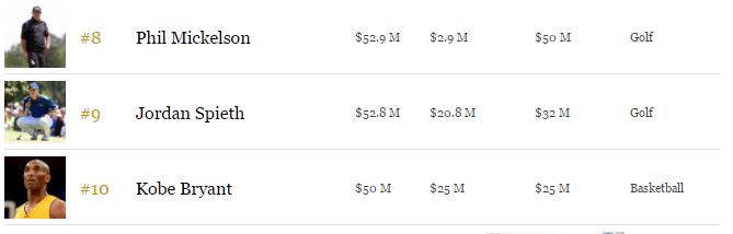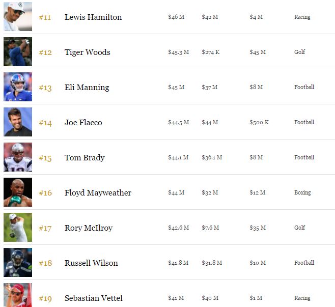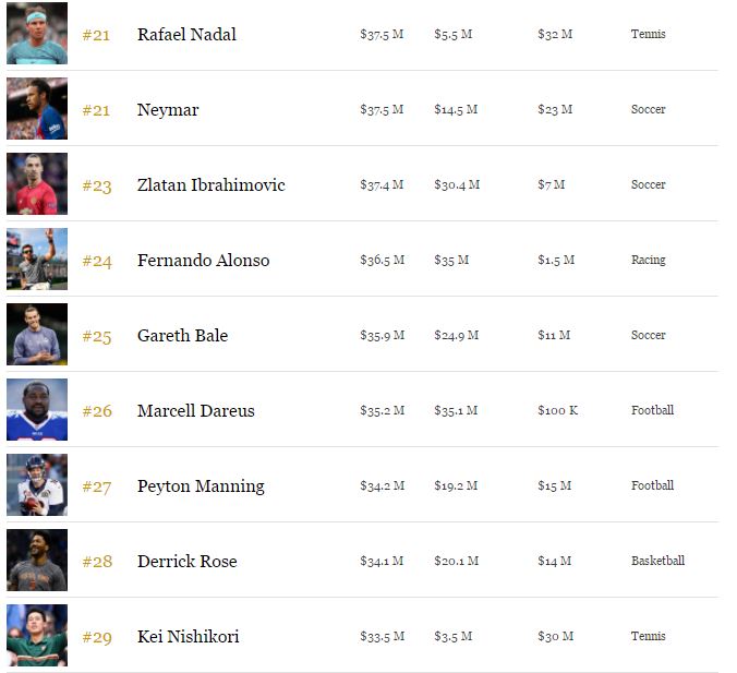 The NBA’s LeBron James ranks third with total earnings of $77.2 million and leads 18 basketball players on the list. Nike signed James to the first lifetime contract in the company’s 44-year history at the end of 2015 (Michael Jordan is presumed to have a lifetime deal in all but name). Sales of James’ signature shoes are down over the past 12 months, but if sales rebound and the four-time MVP can move product after his NBA days are over, the contract will likely pay out more than $1 billion.