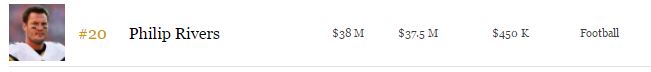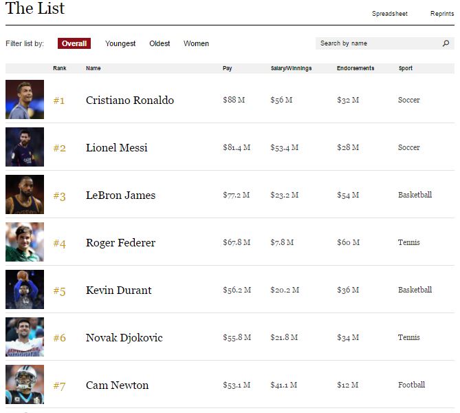 Our earnings figures include salaries, prize money and bonuses paid out between June 1, 2015, and June 1, 2016. Endorsement incomes are an estimate of sponsorships, appearance fees and licensing incomes for the same 12 month period based on conversations with dozens of industry insiders. We do not deduct for taxes or agents’ fees and we don’t include investment income (click here for a more detailed methodology and the numbers behind the top 100).