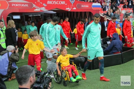 World’s top footballer Cristiano Ronaldo walked out onto the field before the start of the Russia-Portugal football match of the 2017 Confederations Cup accompanied by a disabled ten-year old girl, Polina Khayeredinova, NAN reports.