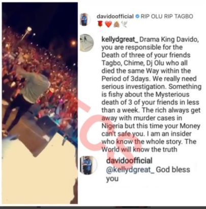“Drama King Davido, you’re responsible for the death of three of your friends, Tagbo, Chime, DJ Olu who all died the same way within the period of 3 days. We really need serious investigation. Something is fishy about the mysterious death of 3 of your friends in less than a week.