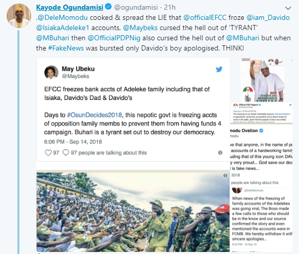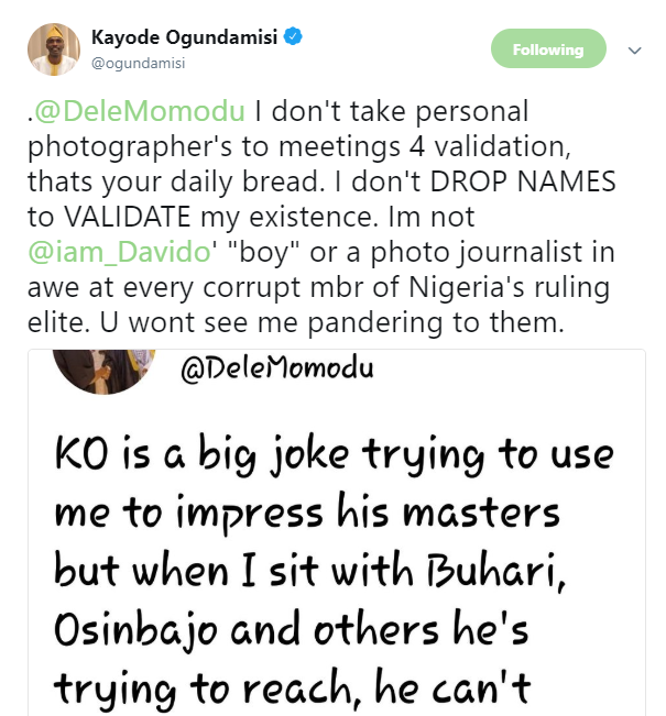 Ogundamisi started the drama when he described Momodu as Davido’s boy after the publisher withdrew his earlier tweet in which he alleged that the EFCC had frozen Davido’s family accounts.