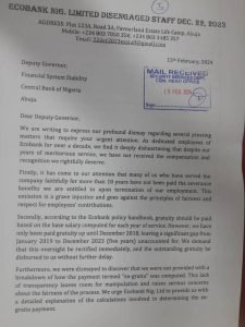 Members of staff of Eco Bank who were recently disengaged on 31st of January, 2024 are aggrieved and they have boldly expressed their dissatisfaction writing to the Central Bank of Nigeria, complaining about how they were being treated following the dismissal from work.
