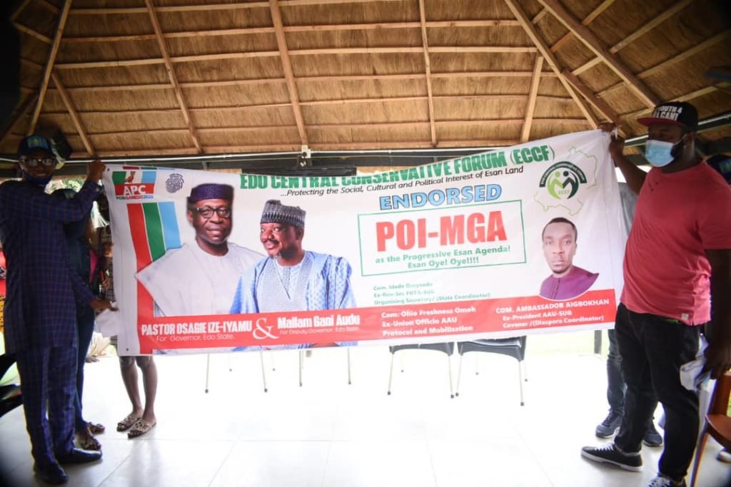 On Tuesday, the 18th of August, a group under the aegis of Edo Central Conservative Forum, (ECCF), endorsed and presented their campaign support donations to the Governorship candidate of the All Progressive Congress (APC), Pastor Osagie Ize-Iyamu (POI) at his residence in Benin City.