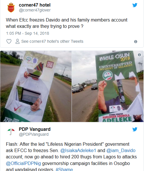 As Nigerians doubted the news, Davido confirmed it by replying some of the tweets confirming the alleged freezing. The Osun State election is scheduled for next week Saturday,and Davido’s uncle, Ademola Adeleke is PDP candidate for the Governorship election. The tweet and other responses below,
