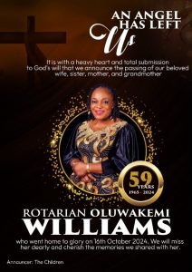The death of Rotarian Oluwakemi Williams, also known as Sister K or Egbon President, has been announced.