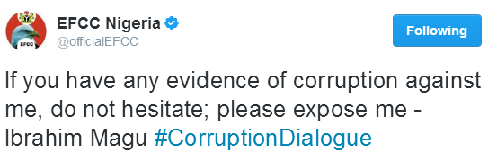 News ‘If you have any evidence of corruption against me, please expose me’- EFCC Ag. chairman, Ibrahim Magu by Reporter March 4, 2017 written by Reporter March 4, 2017 1.2K The acting Chairman of EFCC, Ibrahim Magu, said this when he spoke at the ongoing National Dialogue on Corruption organised by the Presidential Advisory Committee Against Corruption PACAC in Abuja today. magu 0 comments 0 FacebookTwitterPinterestEmail Reporter previous post ‘My wife slept with her ex-husband on our matrimonial bed’, man tells court next post United We Stand Campaign Collective raises awareness for Counterfeiting, Intellectual Property Theft and Piracy in Nigeria. You may also like Emefiele trial: Witness says $6.23m withdrawn from CBN... January 30, 2026 ICPC arraigns Yusuf Mustapha, NIPC deputy director, over... January 29, 2026 Lagos assembly urges govt to intensify public enlightenment... January 29, 2026 Meet The MFM Pastor, Dr. OLUKOYA Is Fond... January 29, 2026 BOLA OYEBAMIJI Can’t Win OSUN Governorship January 29, 2026 Why Many Of Us Can’t Leave PDP January 29, 2026 Nigeria’s Neonatal Care Crisis: Why Urgent Reform Is... January 29, 2026 Pastor KUMUYI’s Son JOHN, Tipped To Succeed Him January 29, 2026 Introducing Princess ISLAMIYAT OYEFUSI January 29, 2026 How TINUBU Plans To Win Northern Votes January 29, 2026