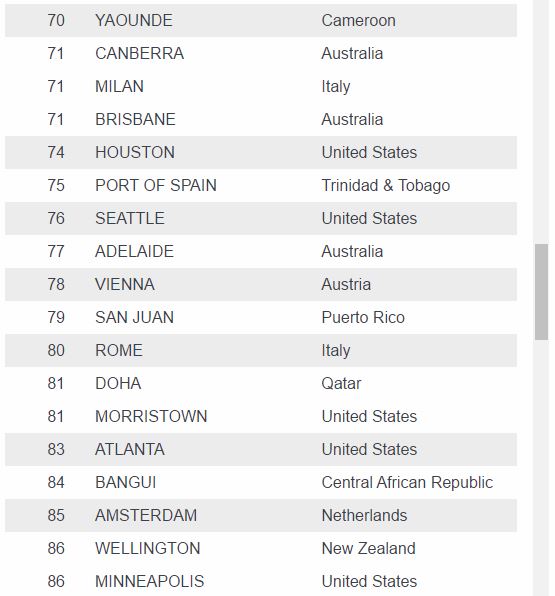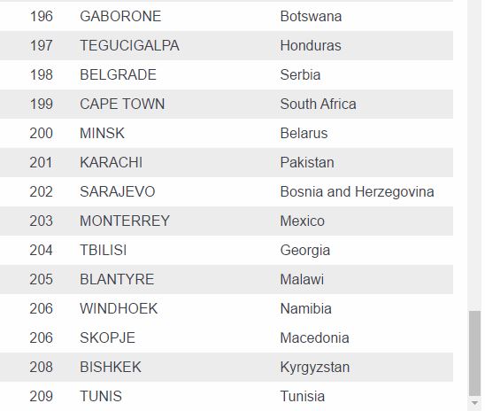 For those in the market for a cheaper expatriate experience, the survey found the least expensive cities are Tunis, ranked 209th, followed by Kyrgyzstan capital Bishkek and Skopje in Macedonia.