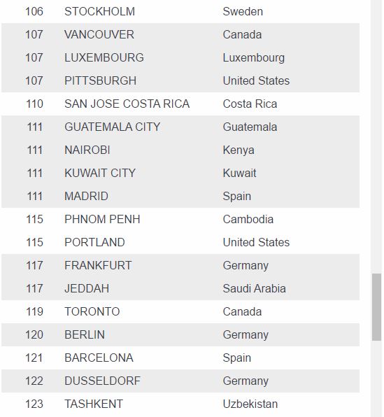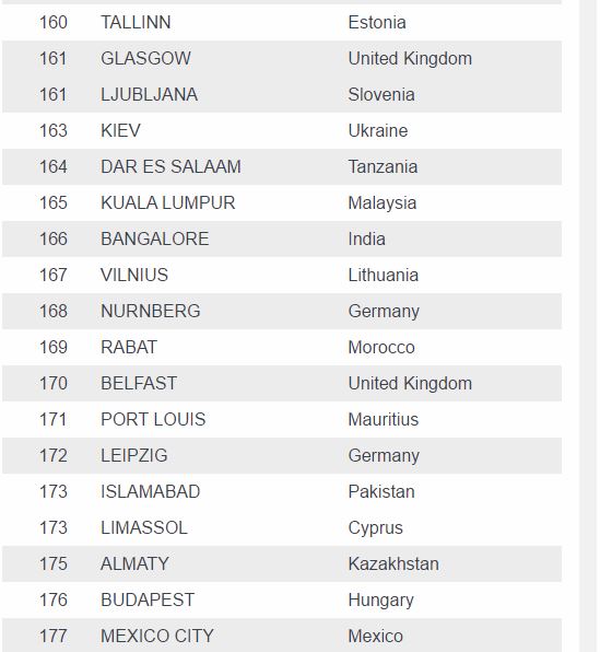While Luanda rose, all UK cities fell significantly in this year’s rankings which were released on Wednesday, with 30th-ranked London dropping 13 places from 2016.