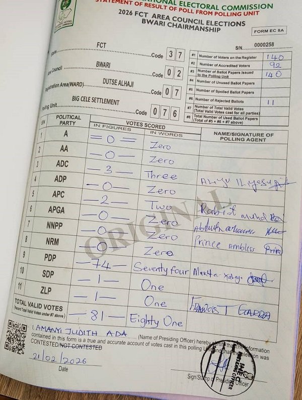 Stakeholders within the party said the outcome reinforces the PDP’s grassroots presence in parts of the FCT and may serve as a morale boost ahead of future electoral contests, including the 2027 general elections.