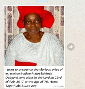 Top Nigerian gospel artist and queen of Gospel music, Tope Alabi has lost her mother. The news was shared with City People Magazine by the actress. She passed in the late hour of Thursday, February 24, 2017, after a brief illness. She was aged 70. She will surely be missed by family and friends.
