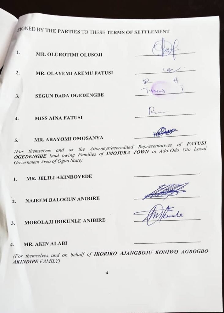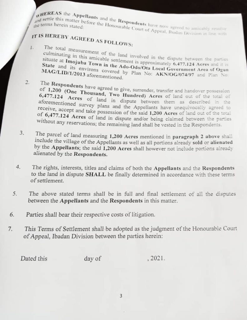 However, after several peace efforts deployed by popular property outfit, Reality Global Properties Limited, the age-long family hostilities between the two clans have been settled. On September 15, 2021, spokesperson of Reality Global Properties Limited, Princess Foyinsola Agbedina converged the leaders of the two families and their lawyers: Sola Ojutalayo (SAN) for the prosecutor and Olusola Dare for the defendant and prevailed upon both families to settle the case out of court. The two parties were made to sign an agreement on land ownership and boundary delineation.