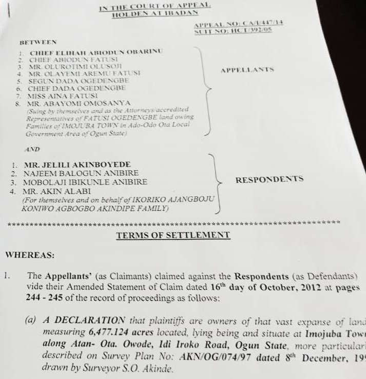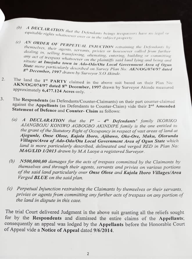 Ajangboju Koniwo Agbogbo Akindipe, who is the appellant has claimed the ownership of a vast expanse of land measuring 6,477,124 Acres located lying being and situated at Imojuba Town, along Atan Ota, Owode, Idi- iroko road, Ogun State, more particularly described on Survey plan number AKN/OG/074/97 dated December 8th, 1997 drawn by Surveyor S, O Akinde. The appellant in their case file alleged that the Fatusi Ogedengbe family had illegally infiltrated and trespassed on the land and attempts to claim ownership.
