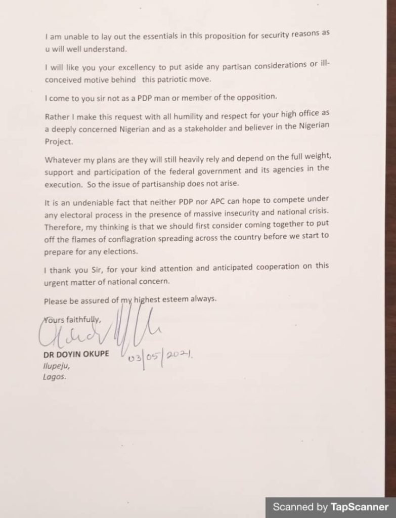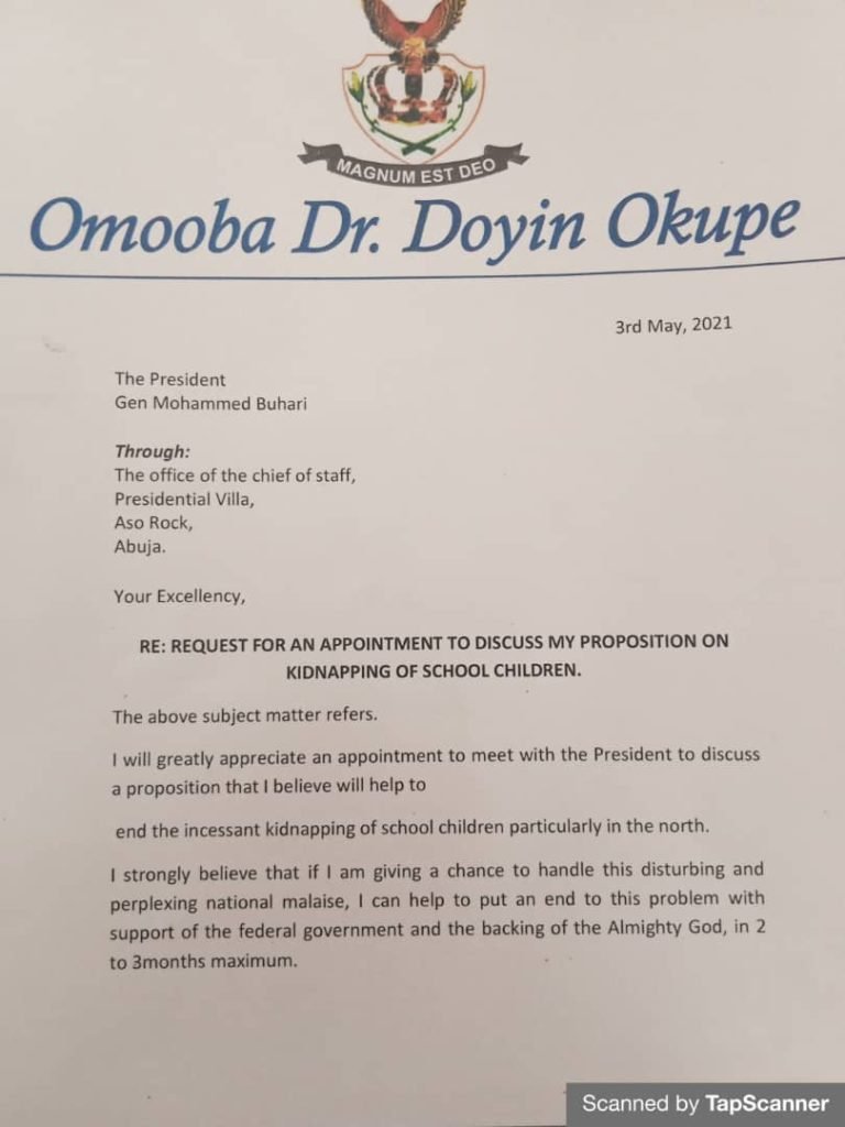 “I will greatly appreciate an appointment to meet with the President to discuss a proposition that I believe will help to end the incessant kidnapping of school children particularly in the north.”