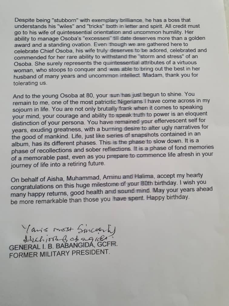 “And to the young Osoba at 80, your sun has just begun to shine. You remain to be one of the most patriotic Nigerian I have come across in my sojourn in life.