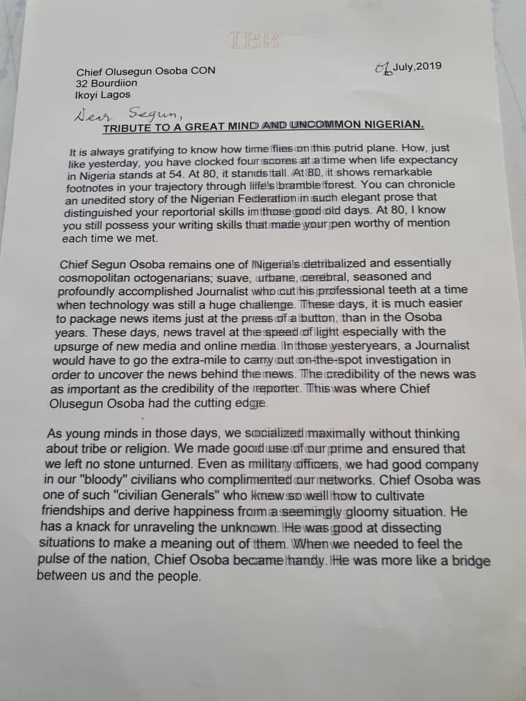 Babangida in a two-page letter titled “Tribute To A Great Mind And Uncommon Nigerian” dated 6th of July addressed to Osoba who clocks 80 on July 15, said the octogenarian as a journalist through his writings was a gap between the military and the civilians during his era.