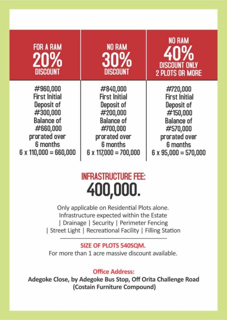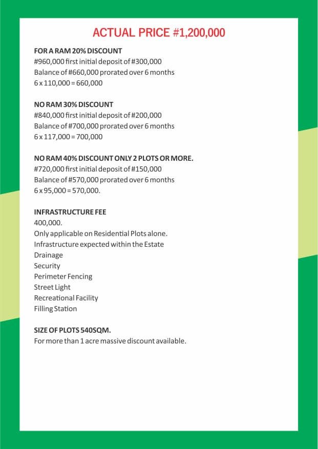 Interestingly, the icing on the cake is “No ram with 40% discount on multiple plots only”. Total package is N720,000, with an initial deposit if N150,000, while the balance of N570,000 to paid within 6 months.