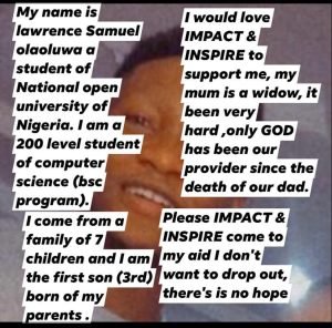 It is disheartening that Nigeria has a high rate of out-of-school children; particularly among young people as evidenced by the numbers of children engaging in hawking and other domestic chores; some of which are hazardous. Unfortunately, this situation fuels the crime rate in the country. Considering these challenges, the Impact and Inspire  (Wuraolami) Foundation has made the provision of quality education one of its main objectives. To achieve this, the charity’s trustees have decided to award educational and vocational scholarships to financially disadvantaged students across the country who meet the necessary criteria.