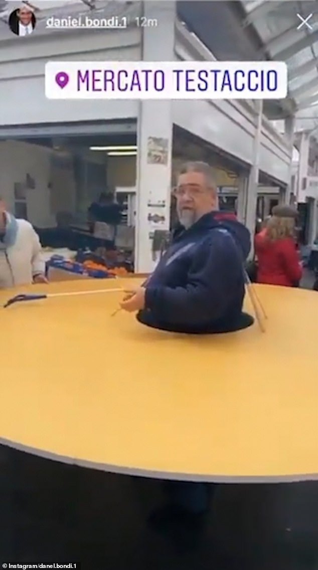 The man leaves the social media user who captured his appearance in hysterics as he visits Testaccio market while shielding himself from fellow shoppers in the elaborate object, which he pairs with a tool used to pick up litter.