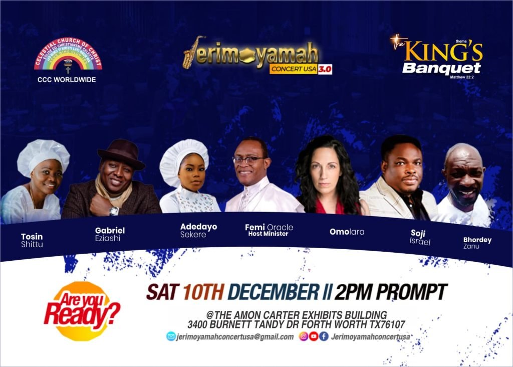 The popular Jerimoyamah concert which is now in its third season is a vision of Icon, a christian outreach ministry dedicated to the great commission through Christian broadcasting and charity initiatives. This year’s event billed to hold at Amon Carter Building 3400 Burnett Tandy DR Forth Worth, Texas, promises to be spirit-filled and life-changing. According to the organizers, some of the finest gospel musicians lined up to bring the heaven down at Jerimoyamah concert 3.0 include Femi Oracle, Tosin Shittu, Gabriel Eziashi, Adebayo Sekere, Omolara, Soji Isreal and Bhordey Zanu.