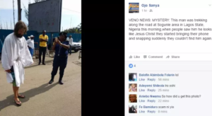 “This man was trekking along the road at Sogunle area in Lagos state, Nigeria, this morning when people saw he look like Jesus Christ, they started bringing their phone and snapping suddenly they couldn’t find him again.”