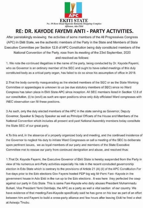 The Governor of Ekiti State, Kayode Fayemi, has been suspended by the State Executive Committee of the All Progressives Congress (APC).