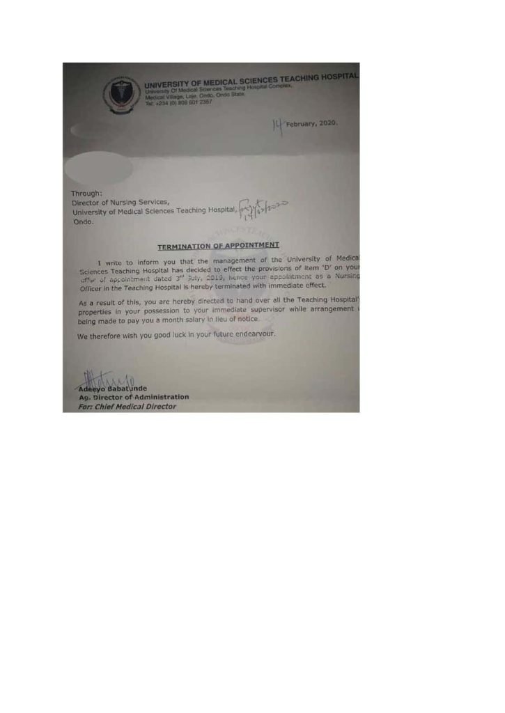 The termination letters of the affected nurses was signed by Acting Director of Administration, Mr Adeeyo Babatunde, on behalf of the Chief Medical Director of the University of Medical Sciences Teaching Hospital, Ondo, Dr Oluwole Ige.