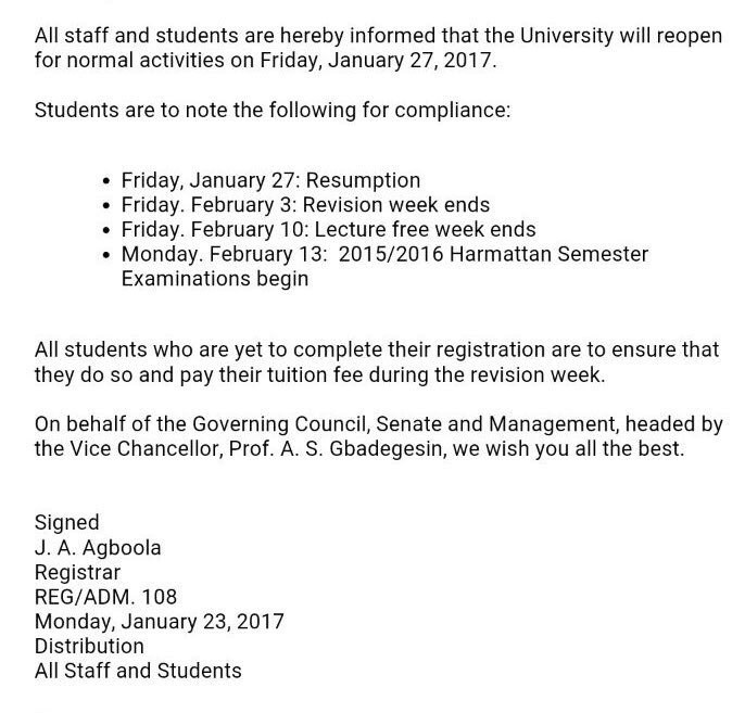 All staff and students of the Ladoke Akintola University of Technology are hereby informed that the University will reopen for normal activities on Friday, January 27, 2017.