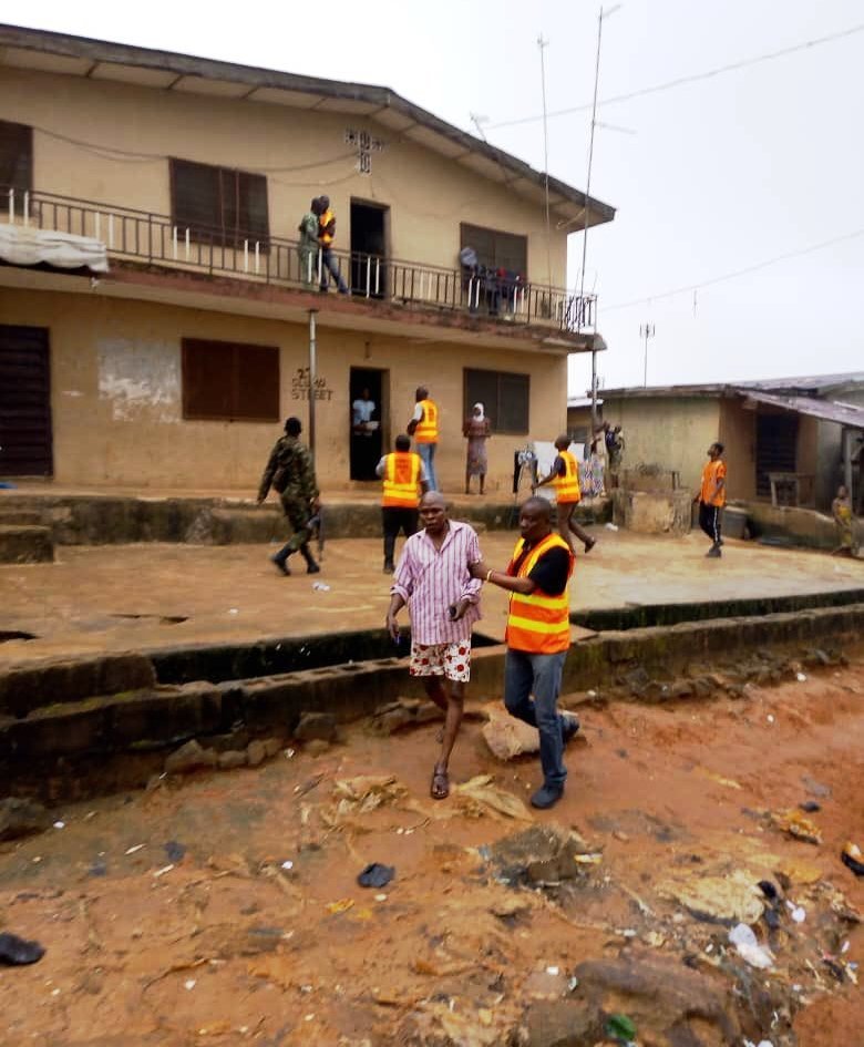 Lagos Waste Management Authority (LAWMA)’s enforcement team effecting arrest of some of the parents of culprits of illegal dumping of waste in the drainage during the last Thursday’s heavy downpour at Olumo street, Off Alabede, street, Pipeline, Aboru, Alimosho, Lagos State.