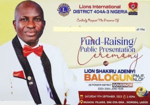 This time around it is holding a 2-in-1 ceremony in Lagos; FundRaising and a Public Presentation of Lion Shakiru Adeniyi Balogun as the District Governor of the prestigious club for the 2023-2024 Lions year.