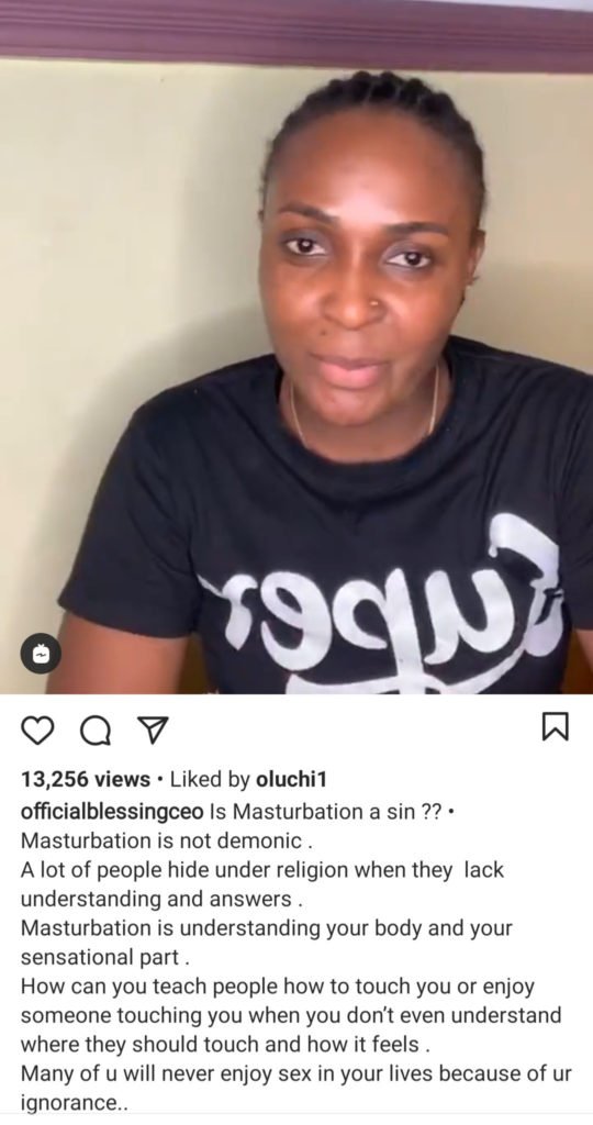 Relationship blogger, Blessing Okoro has opined that masturbation is not a sin but fornication is.
