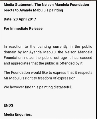 “The Foundation would like to express that it respects Mr Mabulu’s right to freedom of expression. We, however, find this painting distasteful,” the NMF said in a statement released on Thursday. “In reaction to the painting currently in the public domain by Mr Ayanda Mabulu, the Nelson Mandela Foundation notes the public outrage it has caused and appreciates that the public is offended by it.”