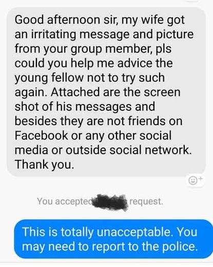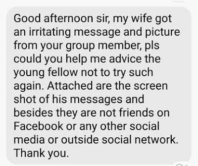 According to him, the angry husband alleged that another member of the group has been sending photos of his penis with explicit messages to his wife. It seems the married woman is not his only victim as some women in the group also complained that they have been receiving similar messages and verbal abuse from the man..
