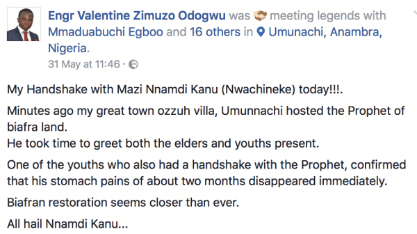 A Facebook user shared this testimony of how a handshake with IPOB leader now turned miracle worker, Nnamdi Kanu healed a man with 2 month old stomach ache.