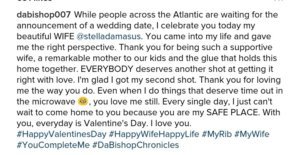 ““While people across the Atlantic are waiting for the announcement of a wedding date, I celebrate you today my beautiful WIFE @stelladamasus. You came into my life and gave me the right perspective. Thank you for being such a supportive wife, a remarkable mother to our kids and the glue that holds this home together. EVERYBODY deserves another shot at getting it right with love. I’m glad I got my second shot. Thank you for loving me the way you do. Even when I do things that deserve time out in the microwave , you love me still. Every single day, I just can’t wait to come home to you because you are my SAFE PLACE. With you, everyday is Valentine’s Day. I love you. #HappyValentinesDay #HappyWifeHappyLife #MyRib #MyWife #YouCompleteMe #DaBishopChronicles”